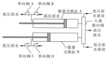 低壓原水從單向閥 A 或單向閥 C 進(jìn)入能量回收裝置,充滿能量交換缸 A 或 能量交換缸 B;高壓濃水從五通換向閥進(jìn)入能量回收裝置,當(dāng)五通換向閥使高 壓濃水與能量交換缸 A 連通時(shí),高壓濃水將能量傳遞給低壓原水,實(shí)現(xiàn)能量交 換,高壓原水從單向閥 B 進(jìn)入反滲透膜壓力容器進(jìn)行脫鹽處理;待將能量交換 缸 A 中的原水全部加壓送至反滲透系統(tǒng)后,五通換向閥,將高壓濃水與能量交 換缸 B 連通,重復(fù)上述能量交換過(guò)程,同時(shí)能量交換缸 A 中低壓原水進(jìn)入,排 出低壓濃水。兩個(gè)能量交換缸交替進(jìn)行高壓濃水與低壓原水的能量交換,實(shí)現(xiàn) 將低壓原水連續(xù)增壓送至反滲透系統(tǒng)進(jìn)行脫鹽處理。