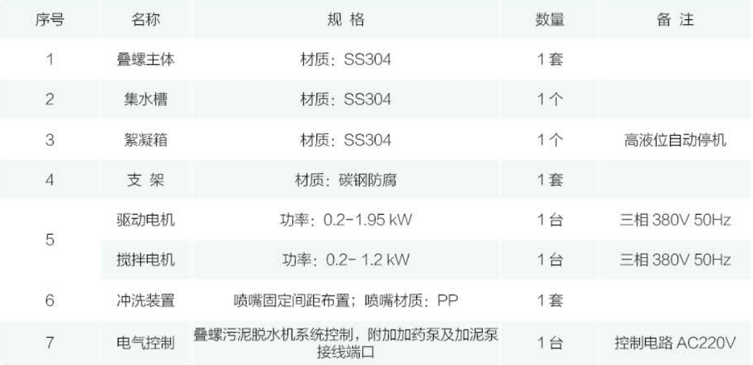 脫水機的主體是由固定環和游動環相互層疊,螺旋軸貫穿其中形成的過濾裝置,固定環和游動環之間形成的濾縫以及螺 旋軸的螺距從濃縮段到脫水段逐漸變小。螺旋軸的旋轉在推動污泥從濃縮部輸送到脫水段的同時,也不斷帶動游動環 清掃濾縫,防止堵塞。